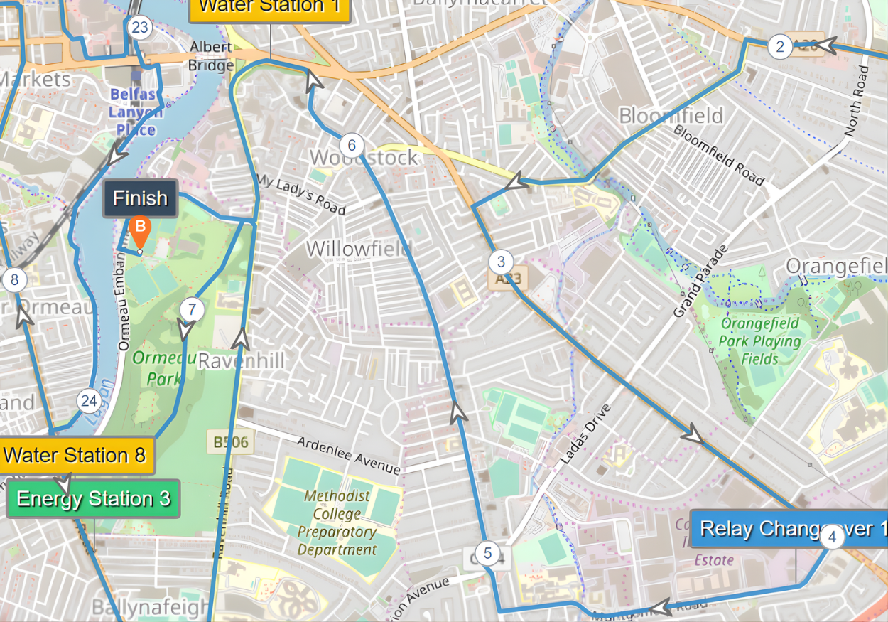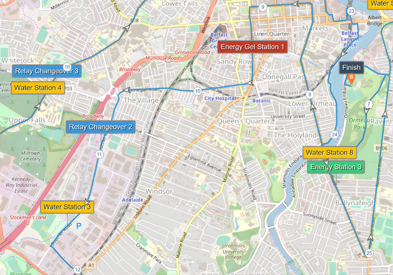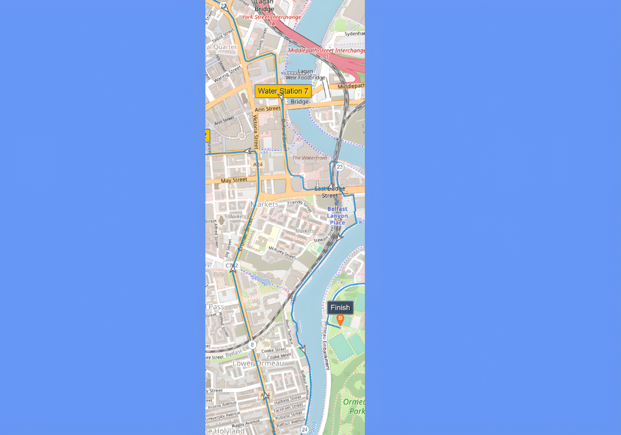 This guide is based on the official route map provided by the Belfast City Marathon organisers via Plotaroute, which you can view here. All mile markers and descriptions are aligned with that version. Please be aware that other versions of the map, such as the JPEG route poster, may show mile markers in slightly different locations.